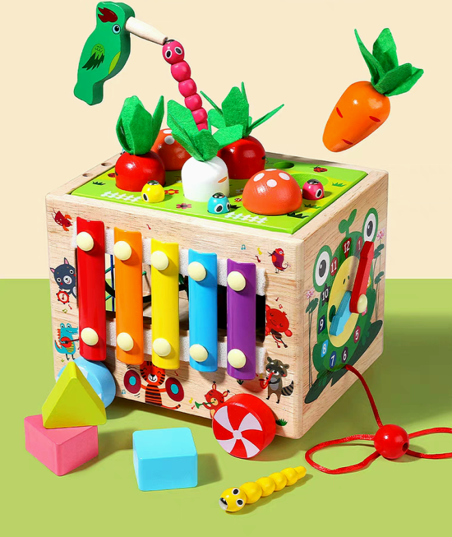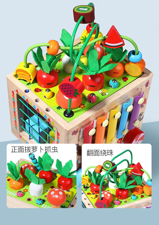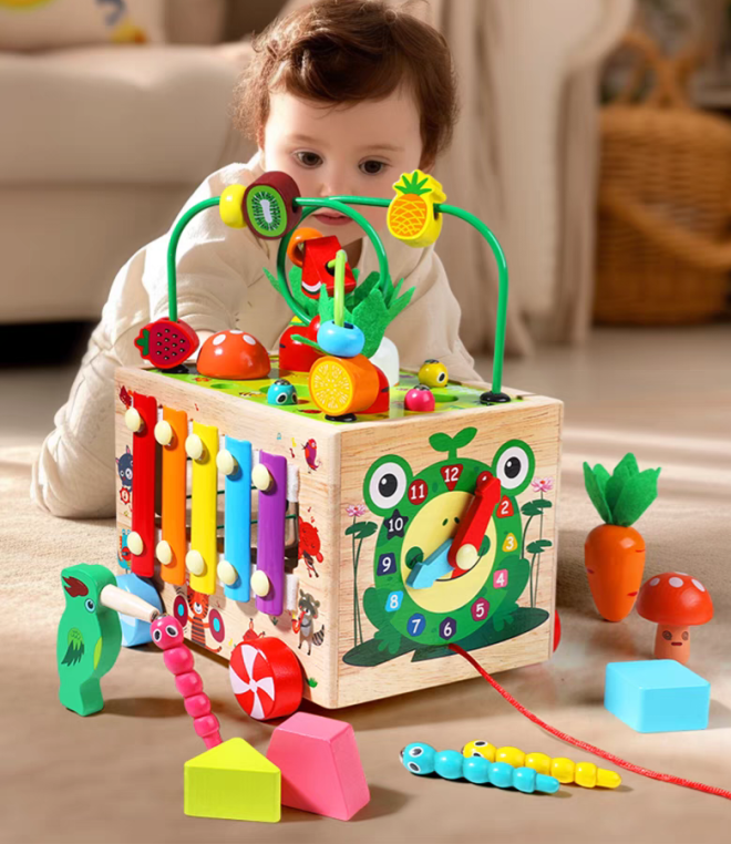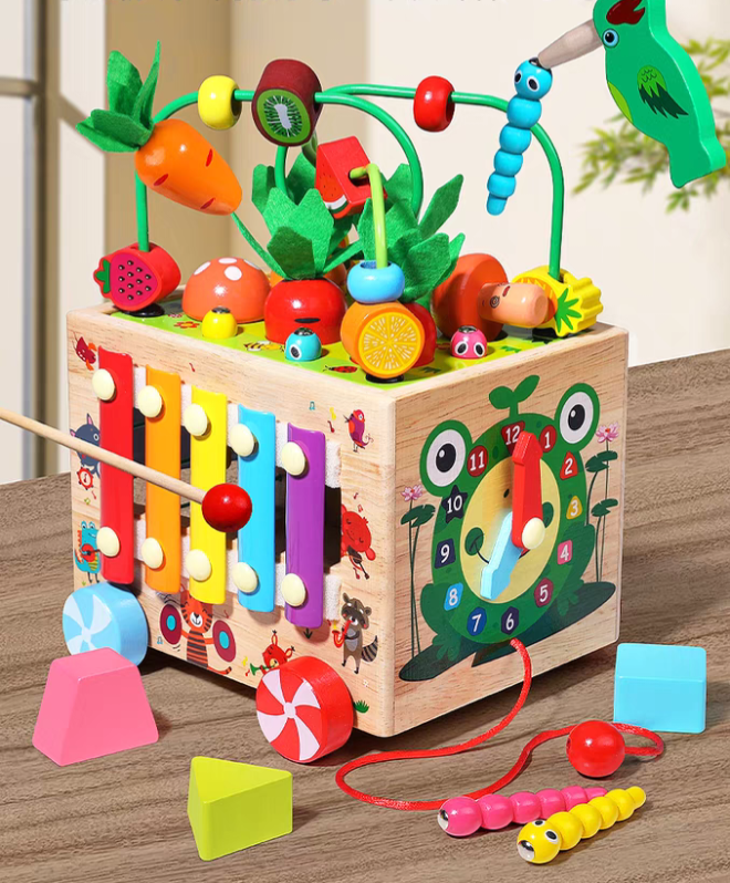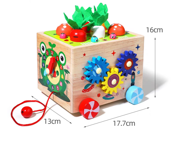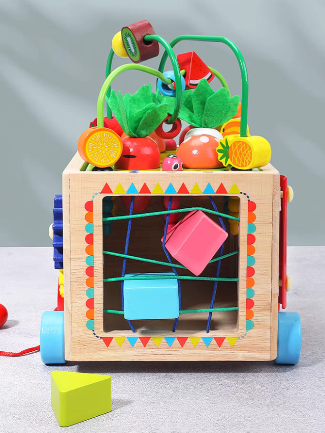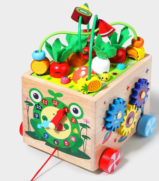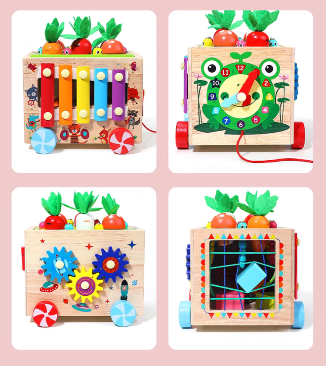 Acest cubul este o jucarie multifunctiona din lemn, educativa, pentru bebelusi, avand ilustrata cate o activitate pe fiecare latura a sa.