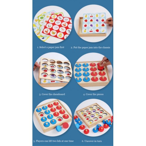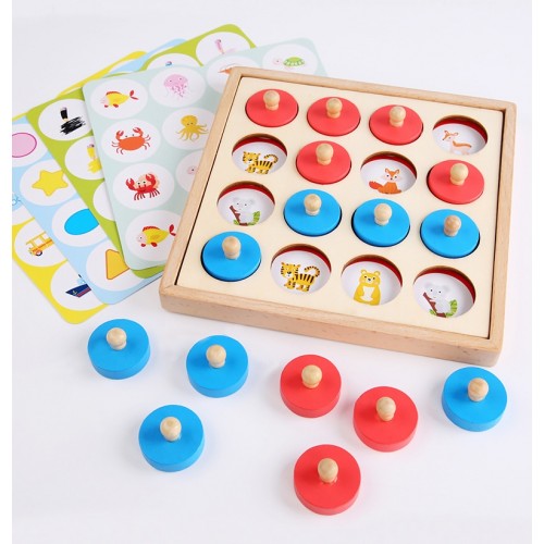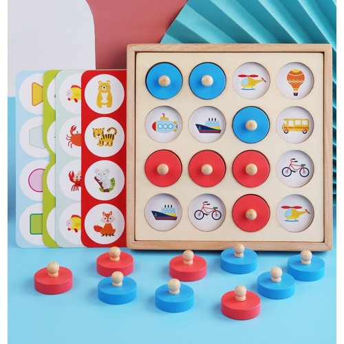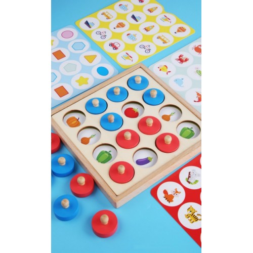 Jocul de memorie si asociere din lemn cu planse si butoni este creat special pentru a antrena si dezvolta gandirea, memorarea si asocierea, dar si imbunatatirea functiilor motorii.