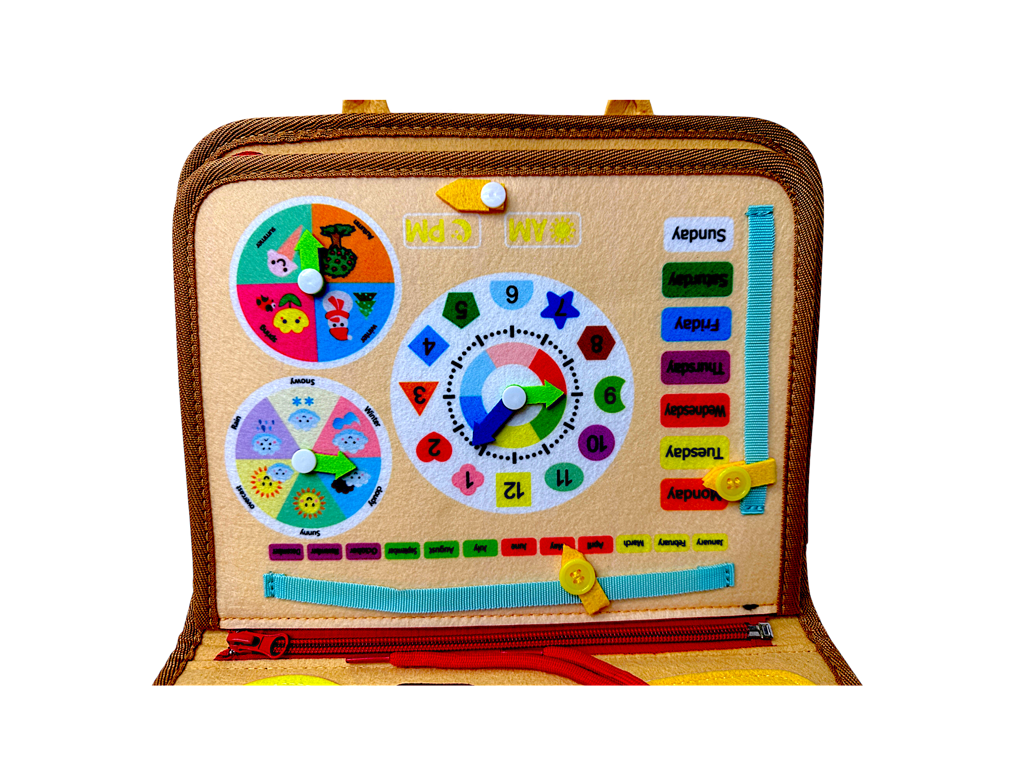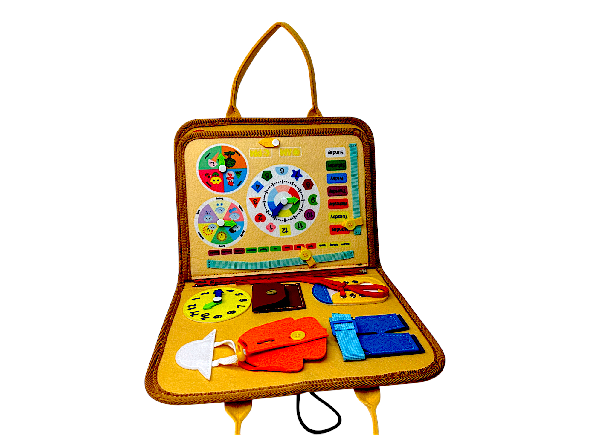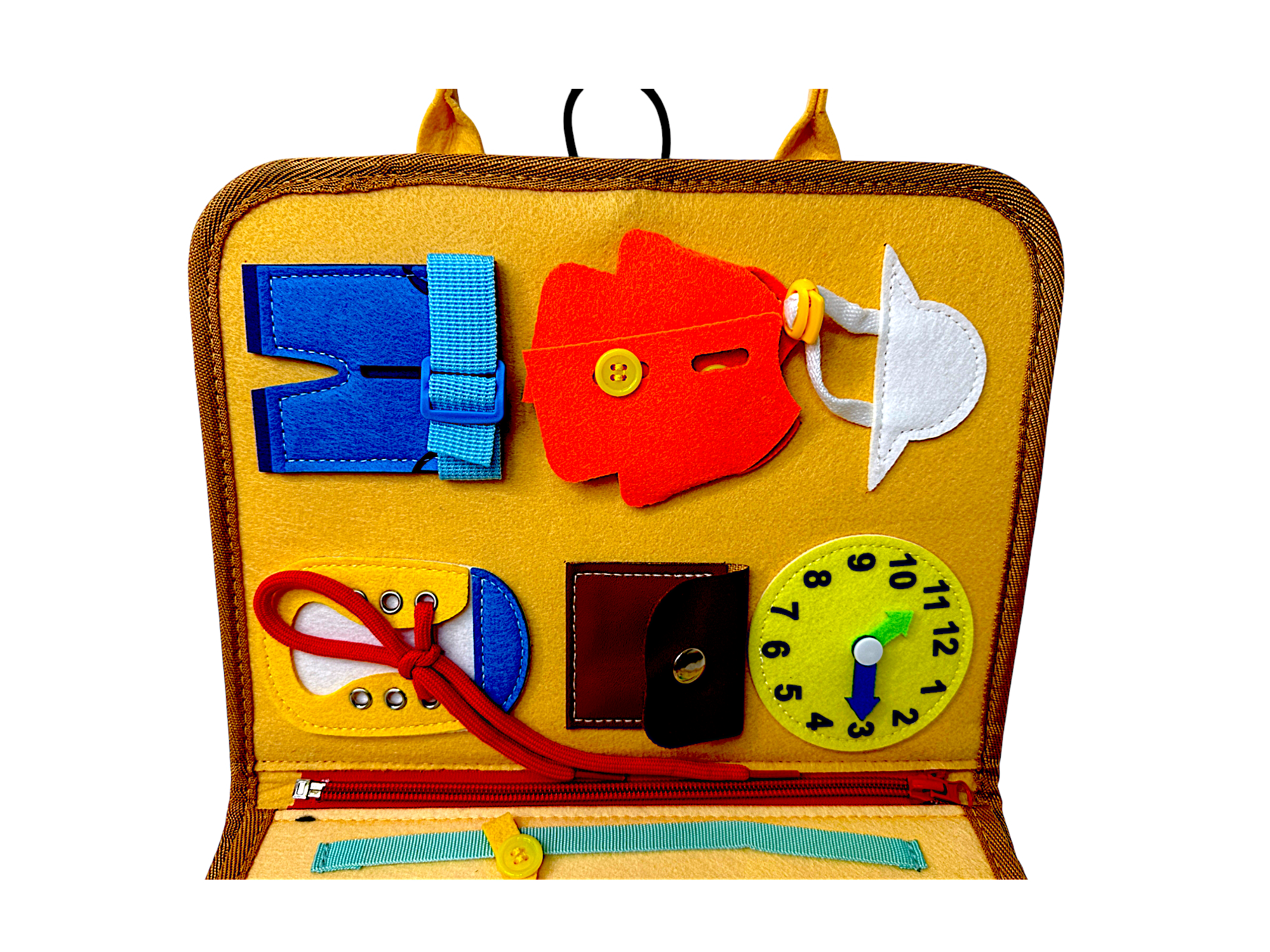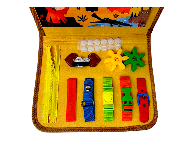 Tabla senzoriala ocupata ii ajuta pe copii sa invete abilitatile de baza de viata prin joc. Aceasta geanta senzoriala ofera sireturi, fermoare, catarame pentru curele, nasturi, puzzle-uri, sunt toate concepute pentru maini mici.