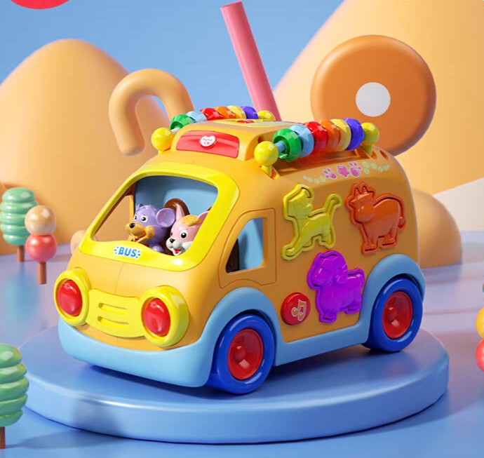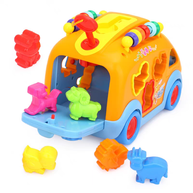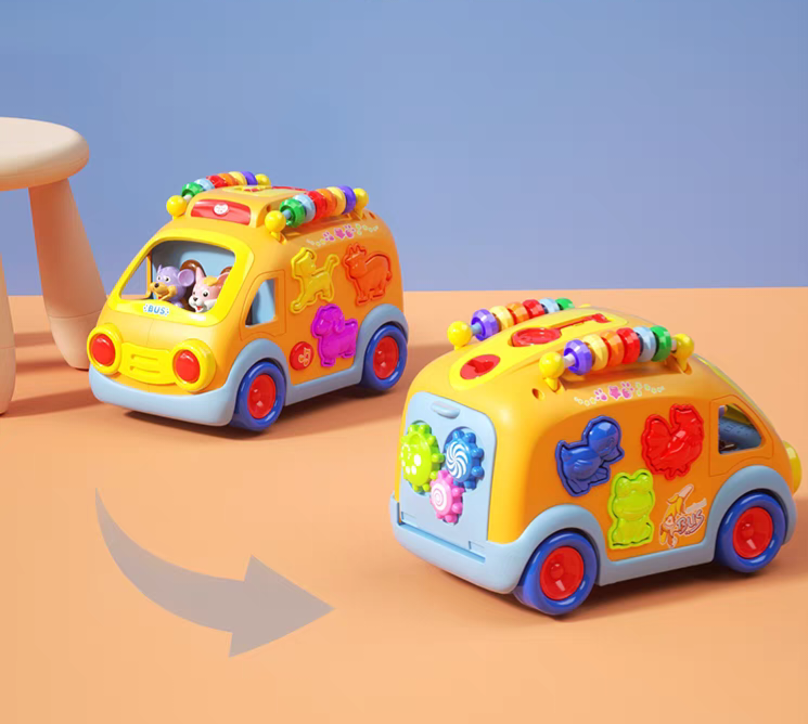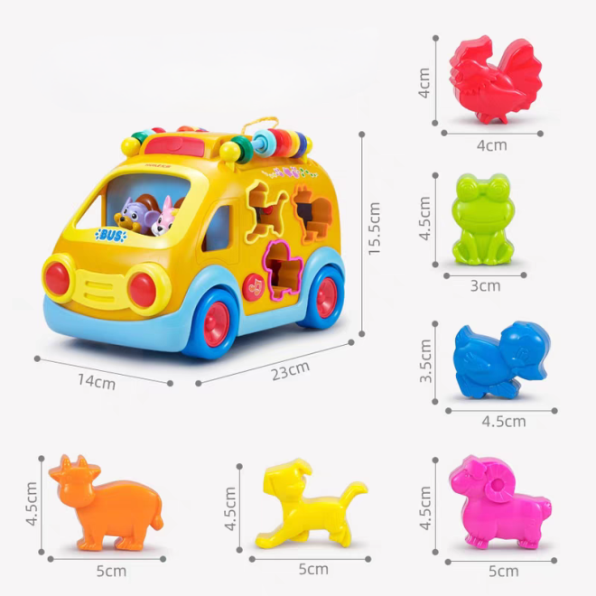 – Sase figurine de animale colorate trebuie asezate in gaurile corespunzatoare de pe lateralele autobuzului. Apoi se aud sunetele acestor animale. Două figurine ale șoferilor de animale din cabina autobuzului se leagănă în timp ce se mișcă, farurile luminează.