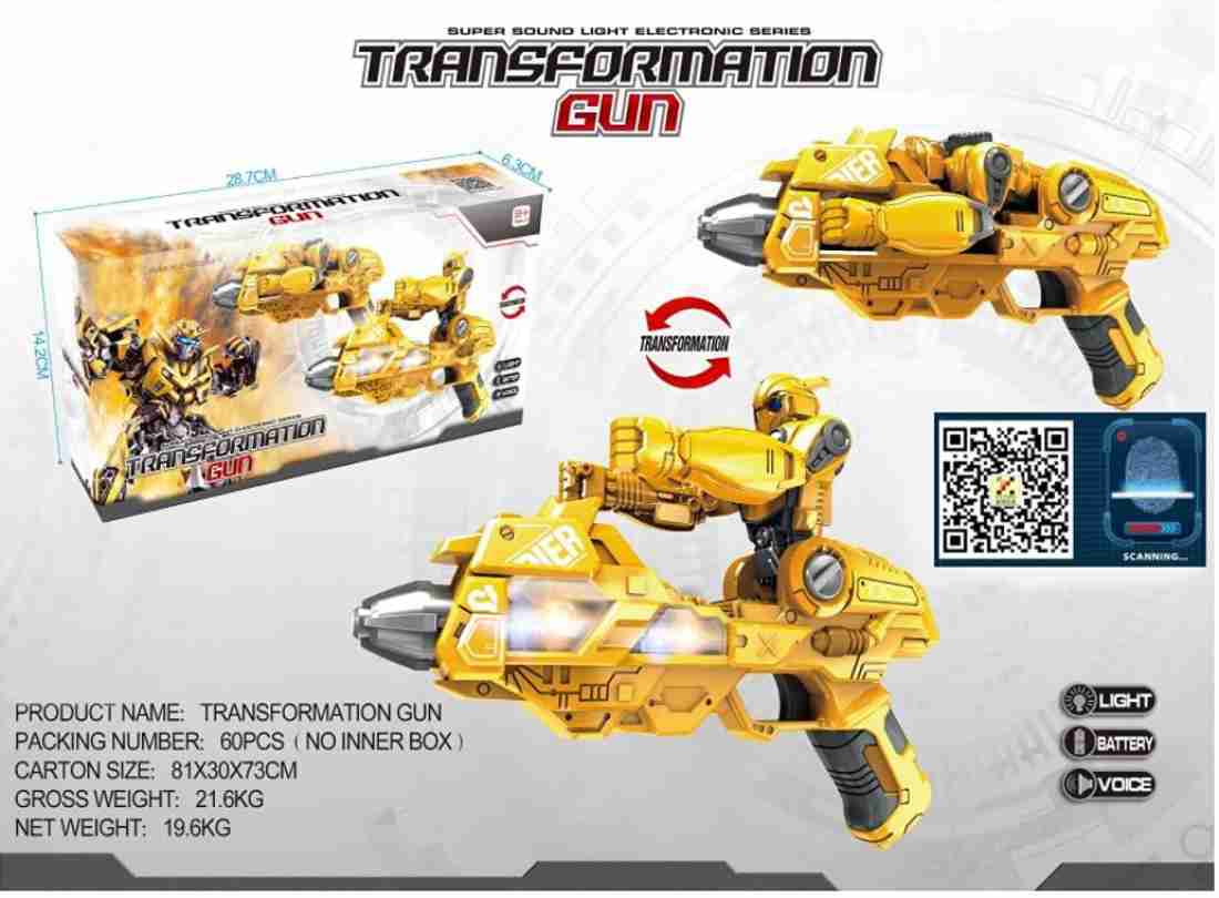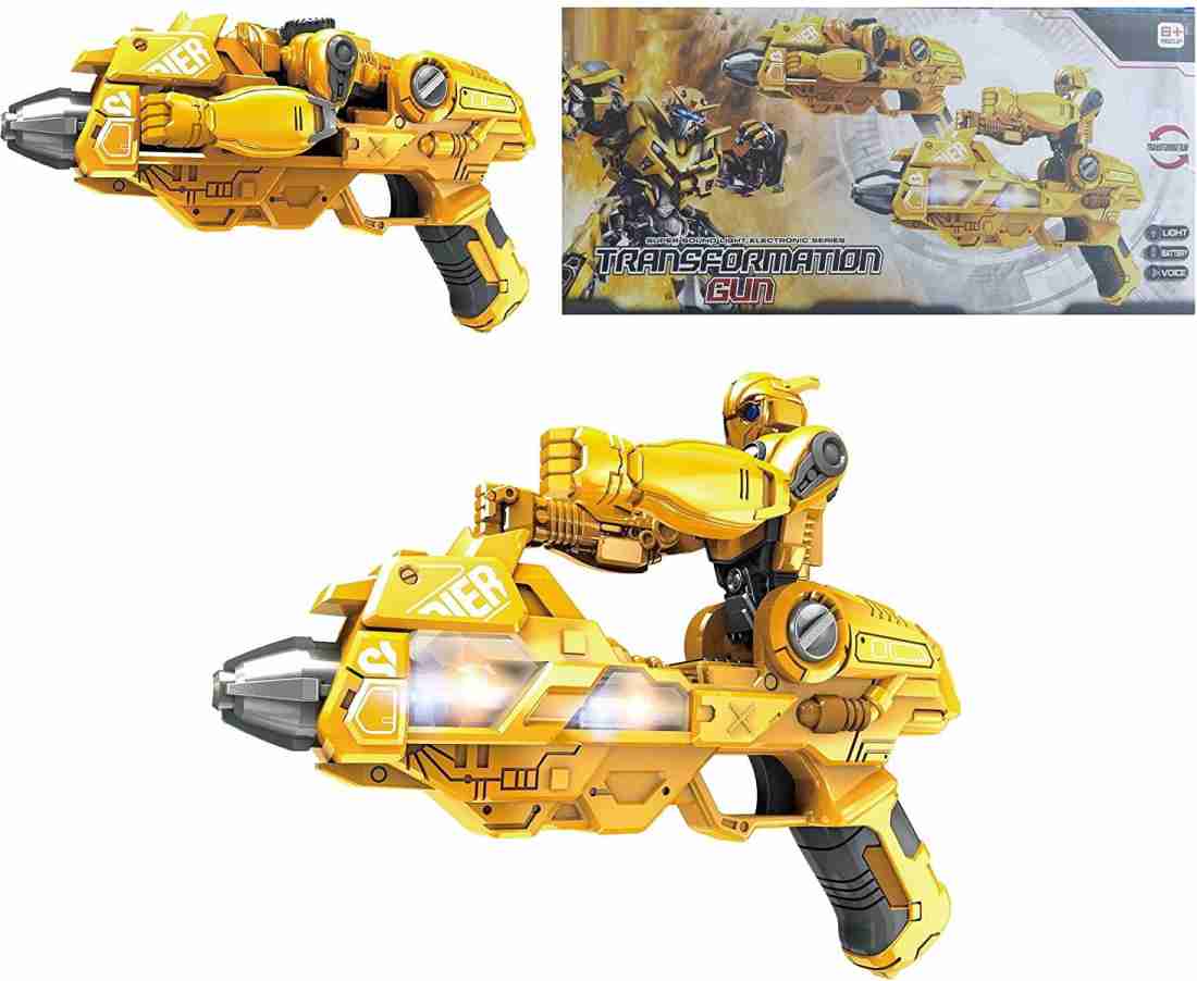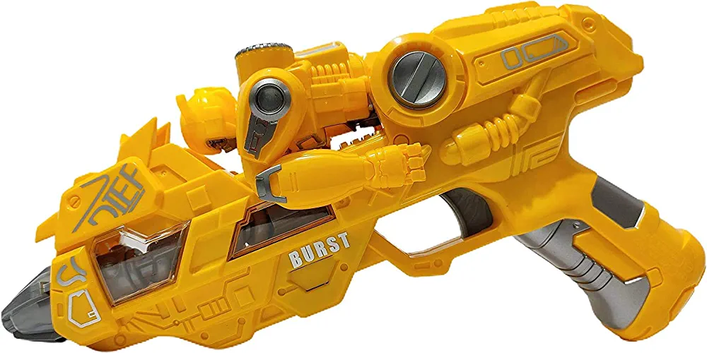 Un pistol de jucărie bine detalizat. Dar principalul punct culminant al acestei jucării nu este în dimensiune și că are efecte de lumină și sunet. Și în faptul că este pistol transformer. Este spectaculos și incitant. Băieții vor fi interesați să se joace, deoarece în loc de o jucărie dorită primesc două.