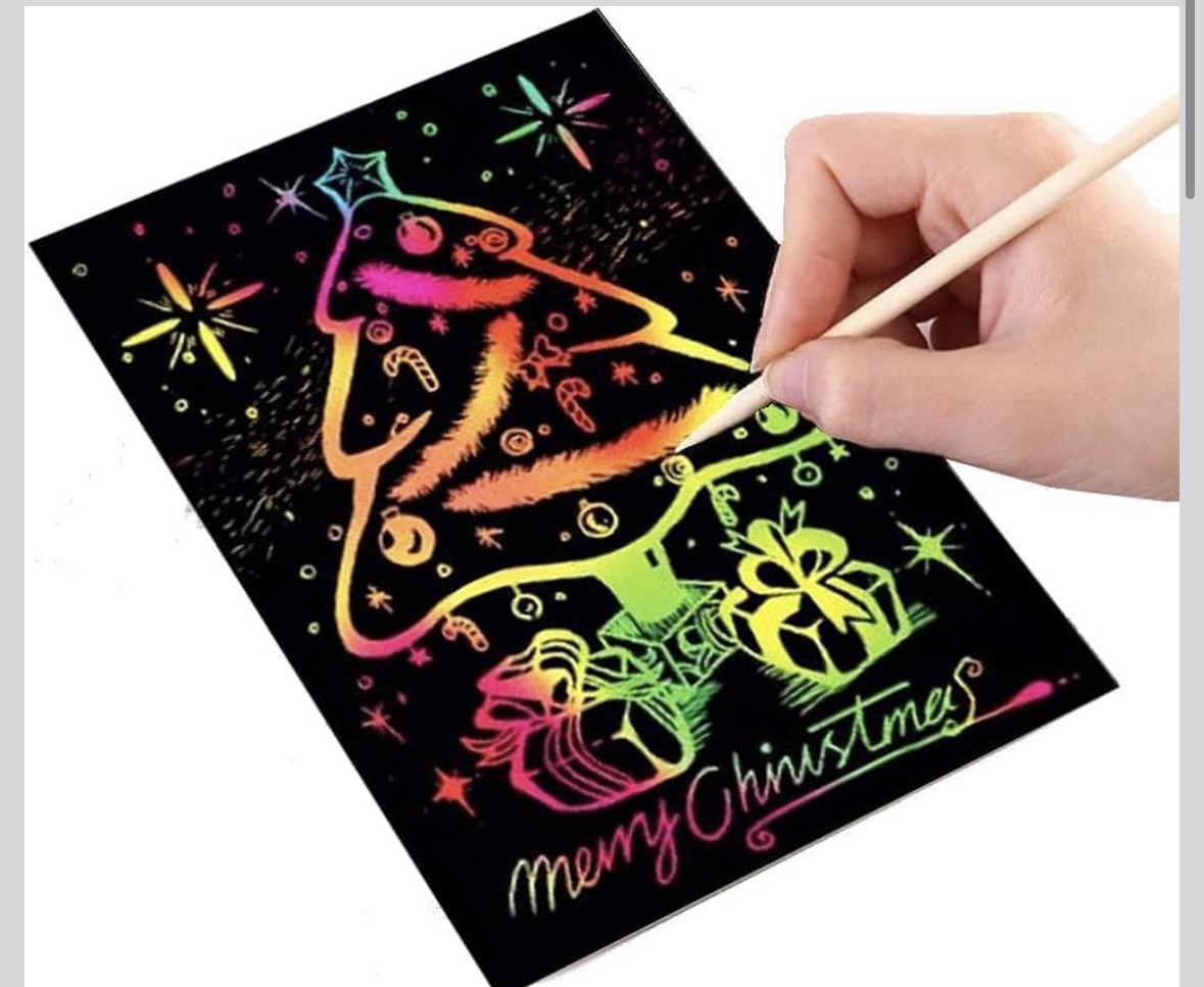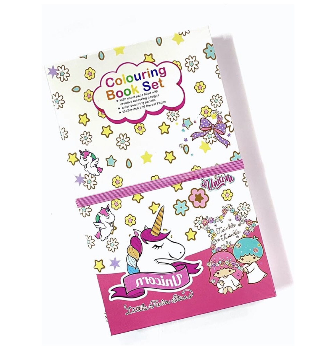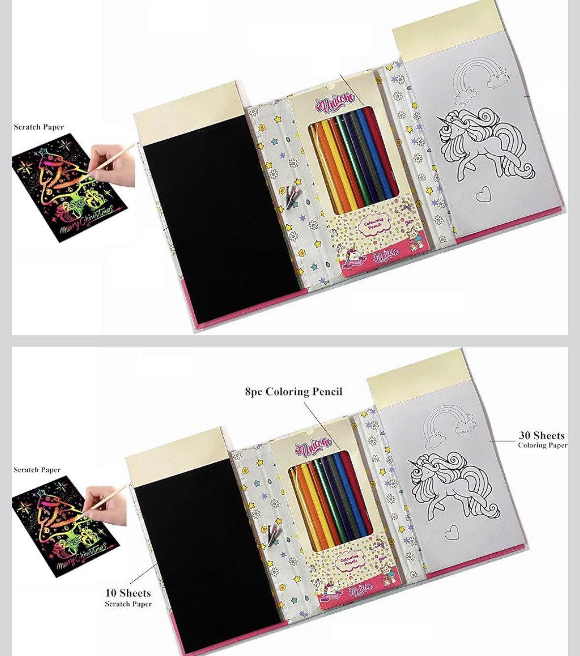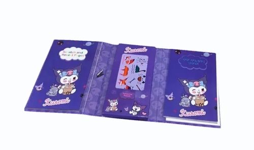 Setul contine creioane colorate, gofraj cu desene, caietul cu desenele si un carnet cu foi negre ce prin roadere reda curcubeul .
