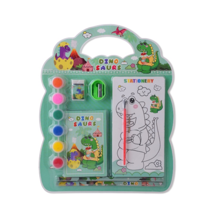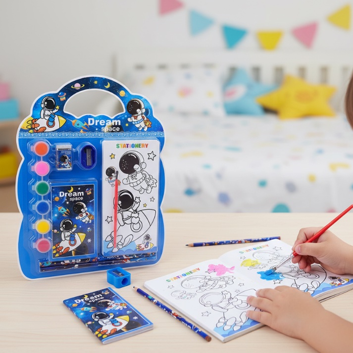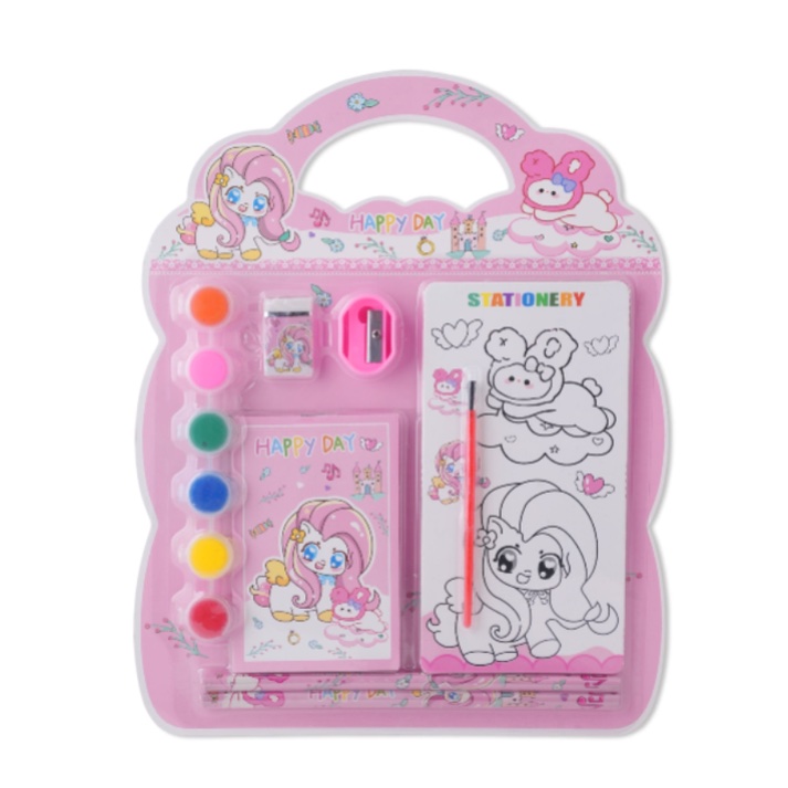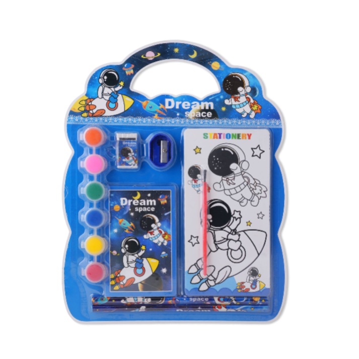 Setul contine Goaș, pensula, caiet de desen, ascutitoare,radiera,creion,pensula, foi de desen.