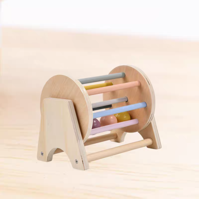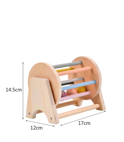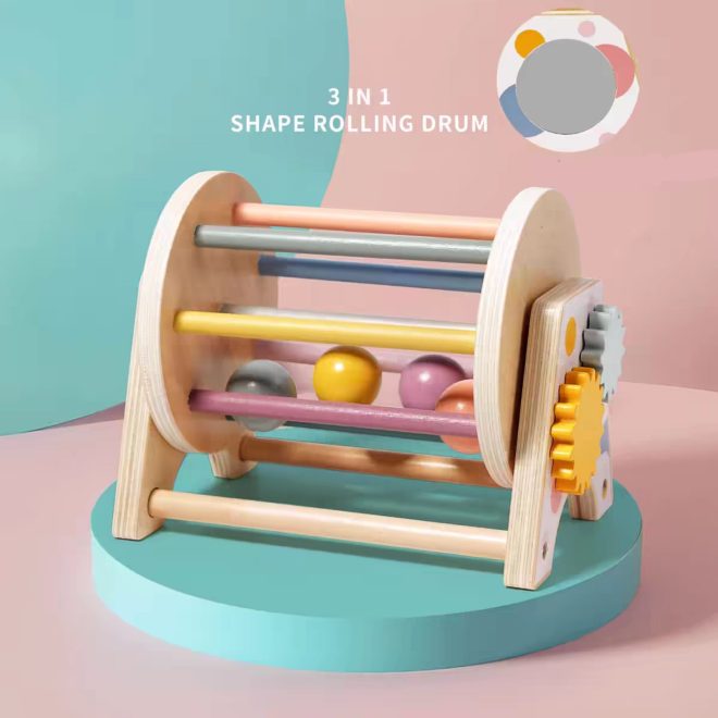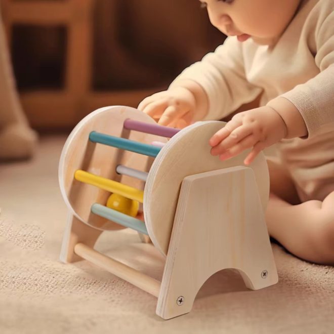 Aceasta jucarie interactiva cu un tambur si cu bile din lemn ofera copilului tau oportunitatea de a se bucura de experimentarea si explorarea miscarii si spatiului.