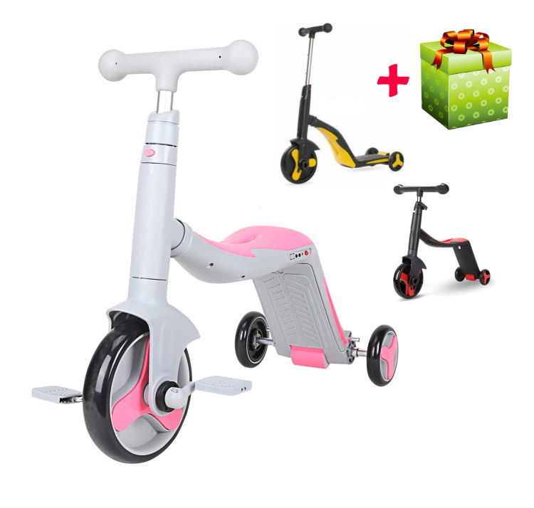Printr-o simpla apasare de buton, Trotineta se transforma intr-o bicicleta fara pedale (“balance bike”), tricicleta si invers.